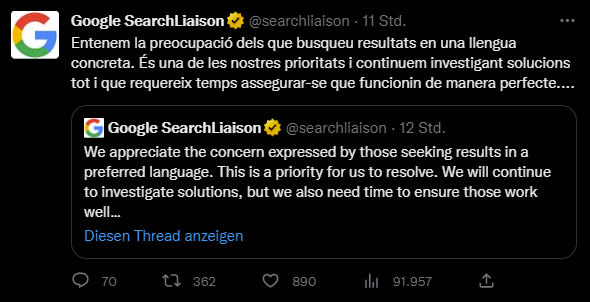 Auf Twitter teilt der Google Mitarbeiter Danny Sullivan eine Entschuldigung für die fortbestehende Probleme und Beschwerden mit der bevorzugten Sprache in den SERPs mit.