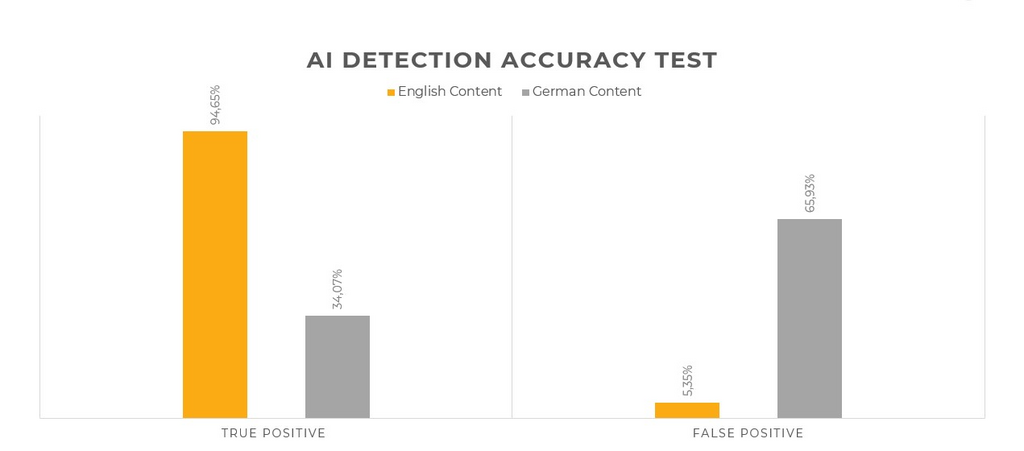 Ich habe 100 von Menschen erstellte Texte in das Tool hochgeladen. Bei den Texten auf Englisch sah alles vielversprechend aus. Originality.ai konnte 94,65 % der Texte als true-positive Texte erkennen. Bei den Texten auf Deutsch hingegen sieht man ein abweichendes Bild. Nur 34,07 % des Inhalts wurden korrekt erkannt: