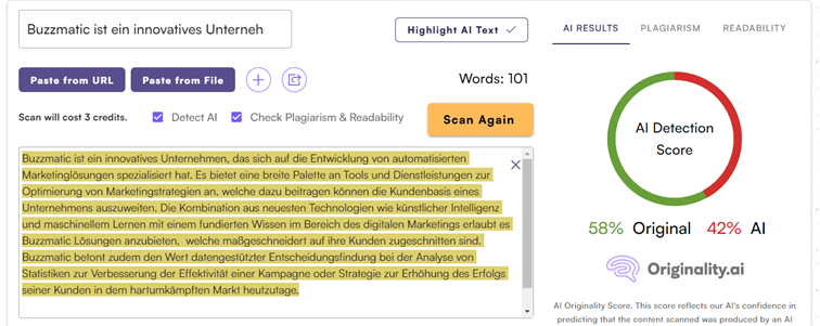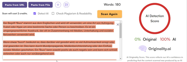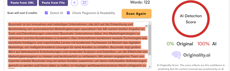 Diese Erkenntnis ließ mich darüber nachdenken, ob man einer KI, wie ChatGPT eine bestimmte Eingabeaufforderung geben kann, damit die Detector-Tools den erstellten Inhalt nicht als KI-erstellt identifizieren können. Deshalb habe ich ChatGPT gebeten, einen Absatz über Buzzmatic zu verfassen, was Originality.ai leicht als KI-generiert identifizieren könnte.