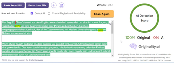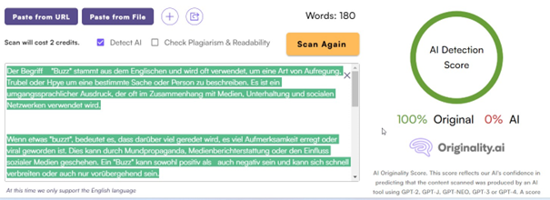 Der gleiche Test wurde auch mit von Menschen erstellten Texten durchgeführt. Es war interessant zu analysieren, wie die Detektor Tools bei von Menschen erstellten Texten funktionieren.