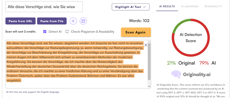 Wie ihr im Beispiel unten sehen könnt, weist das Tool einige Komplikationen auf, um deutsche Originaltexte zu erkennen. Sogar der Originaltext von Adolf Hitler aus dem Jahr 1933 wurde als zu 79 % KI-generiert identifiziert: