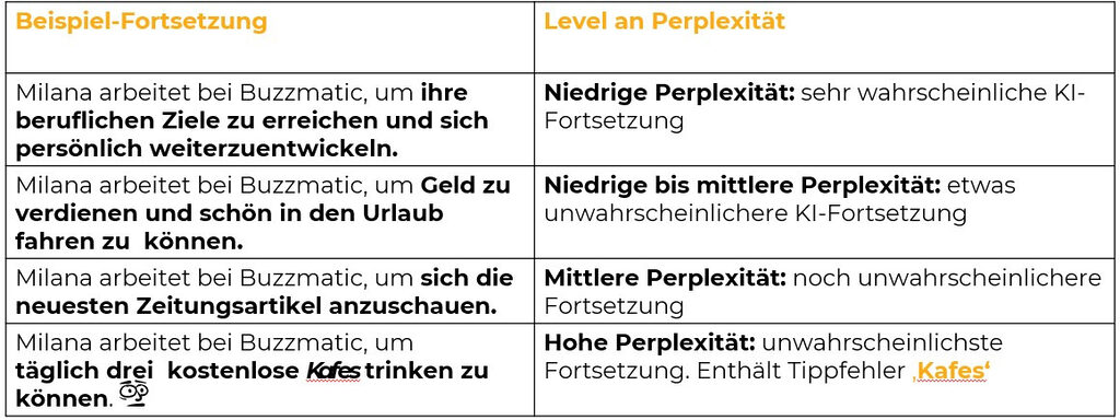 - Niedrige Perplexität= Text ist nicht verwirrend → KI generiert