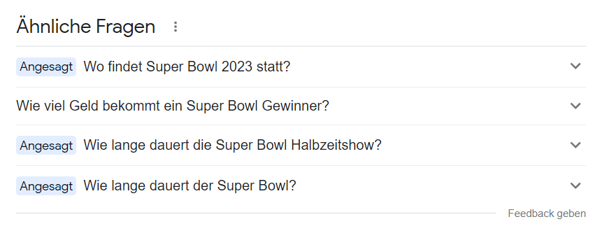 Hier als Beispiel die ähnlichen Fragen, bei einer Desktop-Suche nach dem gestern stattgefundenen “Super Bowl”. An einem unserem Bürocomputer sah die “Ähnliche Fragen”-Sektion so aus: